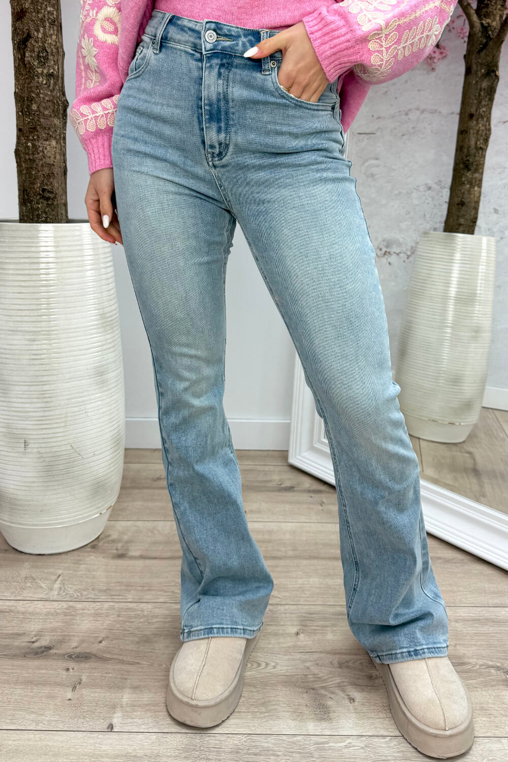Wauww! 🤩Deze flared jeans is echt zo'n broek die je benen eindeloos lang laat lijken! De jeans heeft een mooie hoge taille en loopt vanaf de knie subtiel uit, waardoor je een super vrouwelijke silhouet krijgt. De lichte denim wassing geeft de broek een frisse, tijdloze uitstraling die je het hele jaar door kunt dragen.