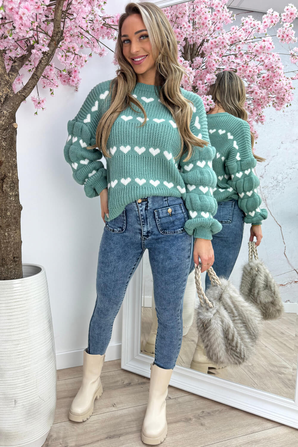 Deze heerlijke gebreide trui zit vol met hartjes (overal ja 😍) en heeft dat leuke bubble effect op de mouwen, wat ’m net even extra maakt. Zacht, comfy en precies zo’n trui waar je meteen blij van wordt zodra je ’m aantrekt. Perfect om eindeloos te combineren en ideaal voor elke dag!