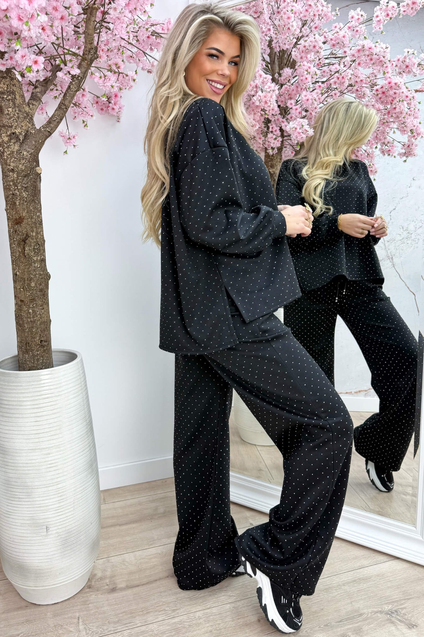 DIAMONDS ARE A GIRL’S BEST FRIEND! 💎 O-M-G… dit co-ord is in één woord G-E-W-E-L-D-I-G! 😍 De Diamond Comfy Co-ord bestaat uit een trui met speelse splitjes aan beide zijkanten en een bijpassende jogger. Gemaakt van een zachte stof met shiny diamantjes all-over (zó leuk)! ✨