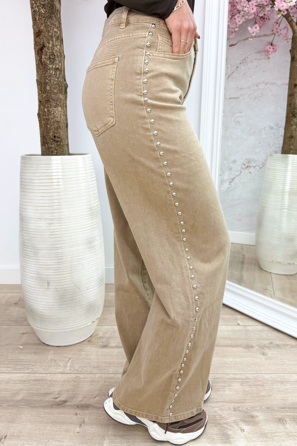 De Studded Wide Leg Jeans RD9118-15 komt in zo’n mooie taupe kleur (serieus, alles staat hier goed bij) en die zilveren studs aan de zijkant? Ja hoor… dát maakt ‘m! 😏