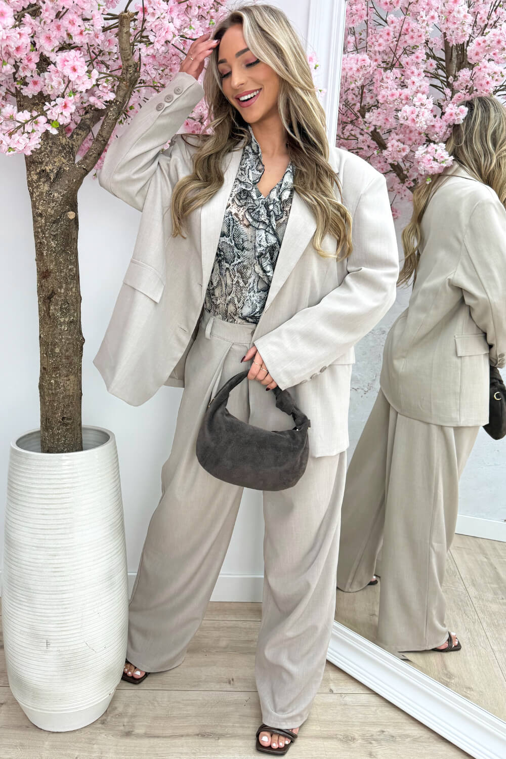 De blazer heeft schoudervulling, een knoopsluiting en die heerlijke oversized look waar we allemaal fan van zijn. De pantalon sluit mooi aan door het elastiek aan de achterkant — comfy én chic tegelijk. Samen zijn ze de ultimate match, maar los van elkaar kun je er ook zóveel leuke outfits mee maken.