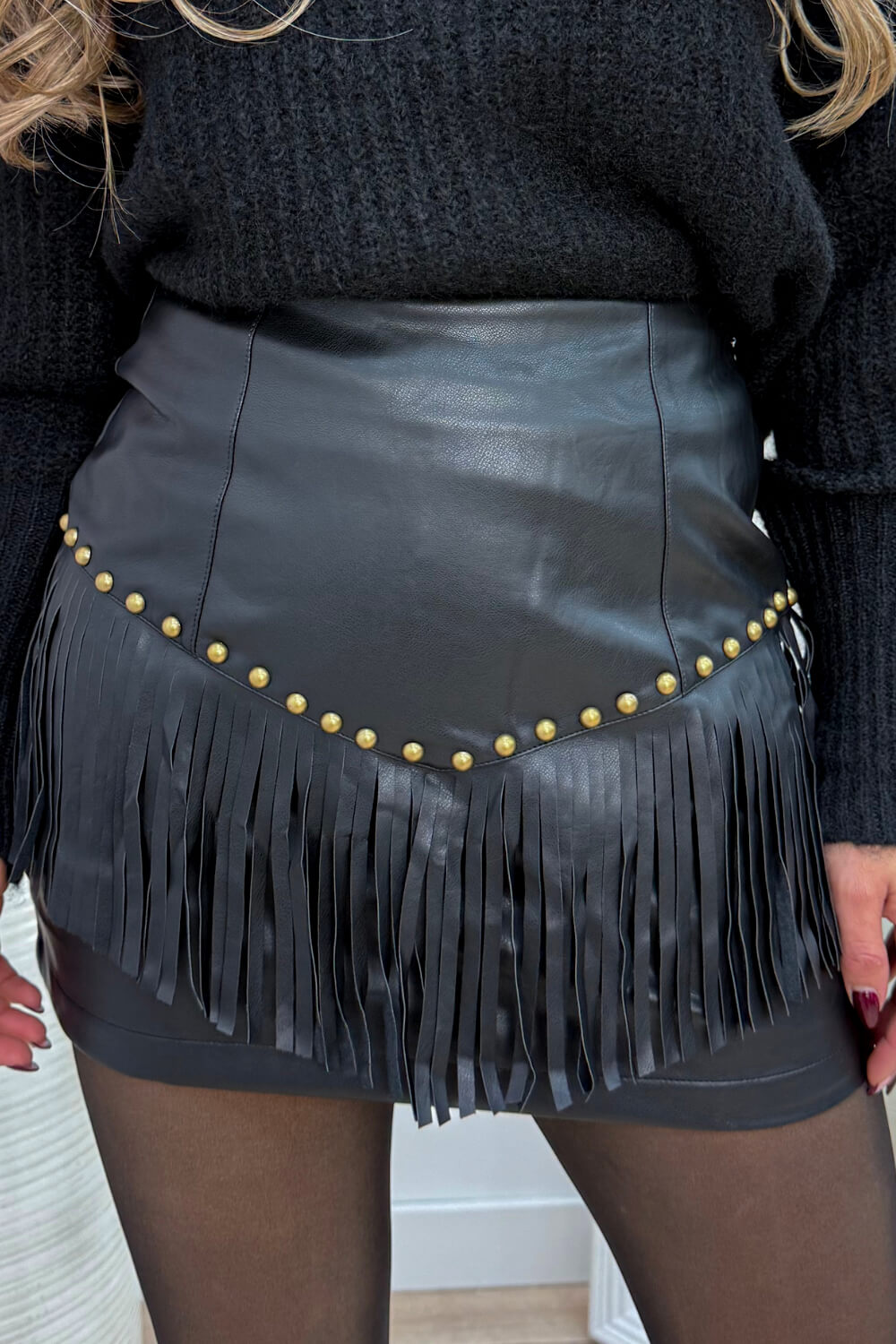 Leather look studded fringe skort - Zwart