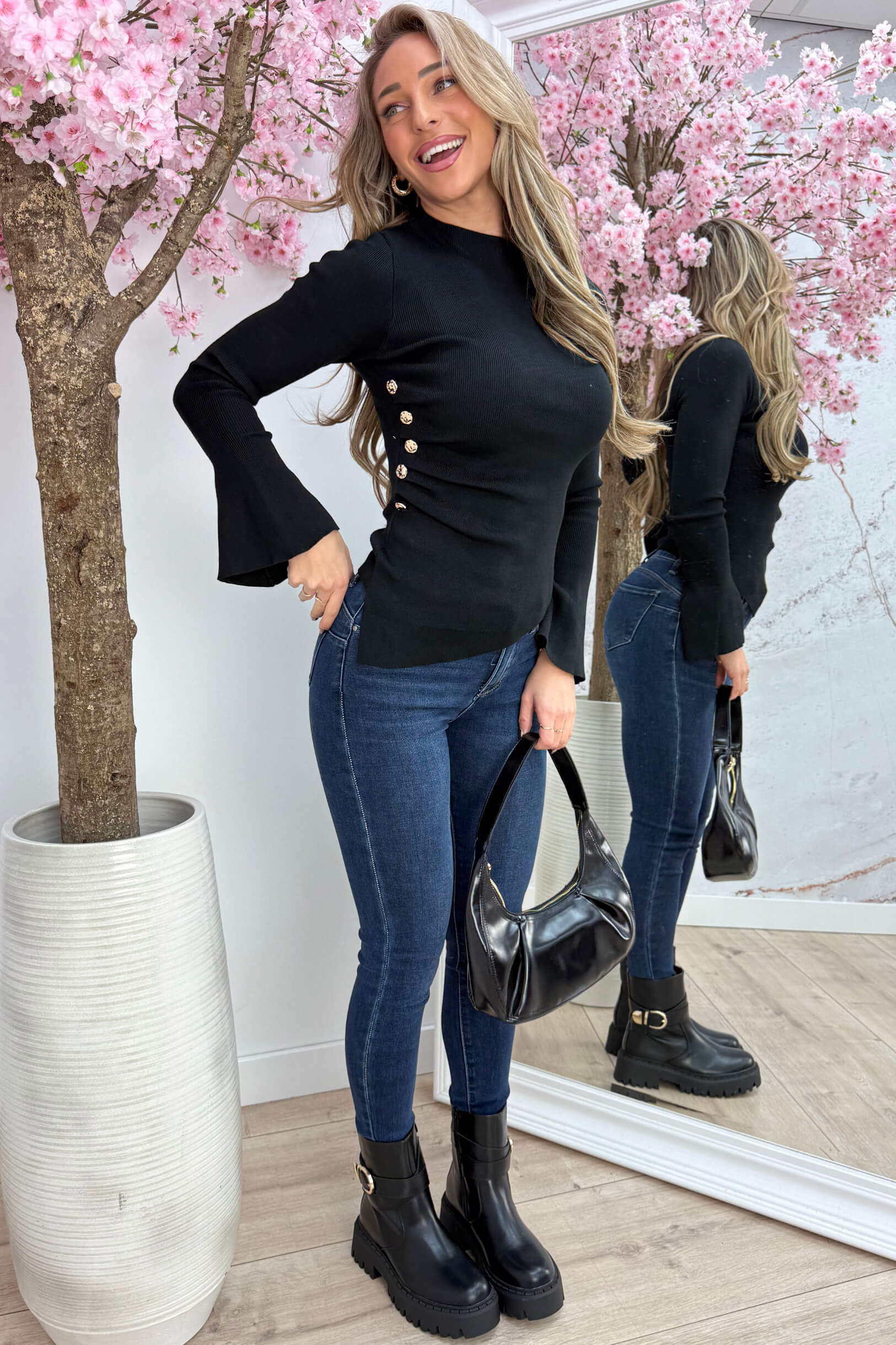 BUTTON UP! ✨ Oh-my… het Button Flair Topje is écht zo’n topje waar je meteen verliefd op wordt! De gouden knopen aan de zijkant, het gedrapeerde detail én die asymmetrische voorkant zorgen samen voor de perfecte fit (zoooo mooi!). De flair mouwen maken ‘m helemaal af — classy met een speelse twist.