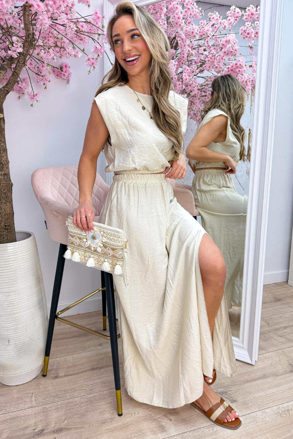 De Costa Co-ord wordt echt jouw go-to deze zomer! 🤭 De lange rok heeft een elastische tailleband (dus zit lekker én sluit mooi aan 😌) en het cropped topje heeft ook elastiek waardoor ‘ie superleuk valt! En die stof… luchtig, flowy en precies wat je wilt als het warm is! 🐚