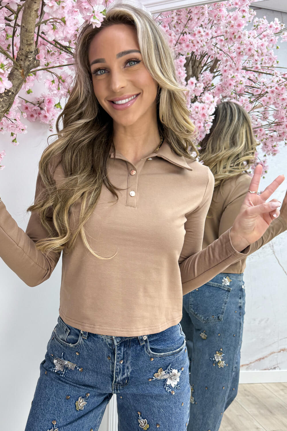 De blouse kraag geeft een nette, classy uitstraling en die drie knoopjes bij e hals zorgen voor en subtiele details.