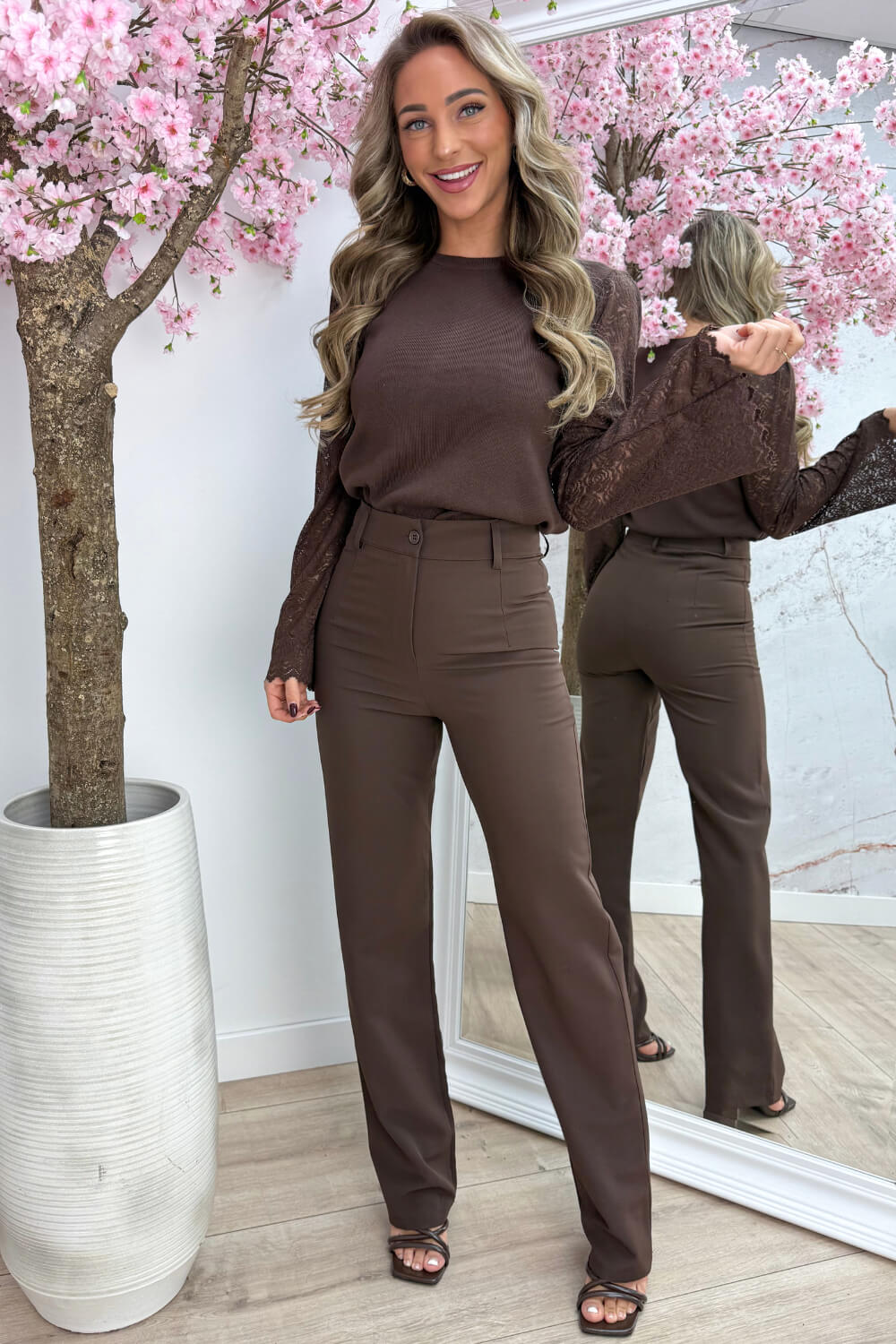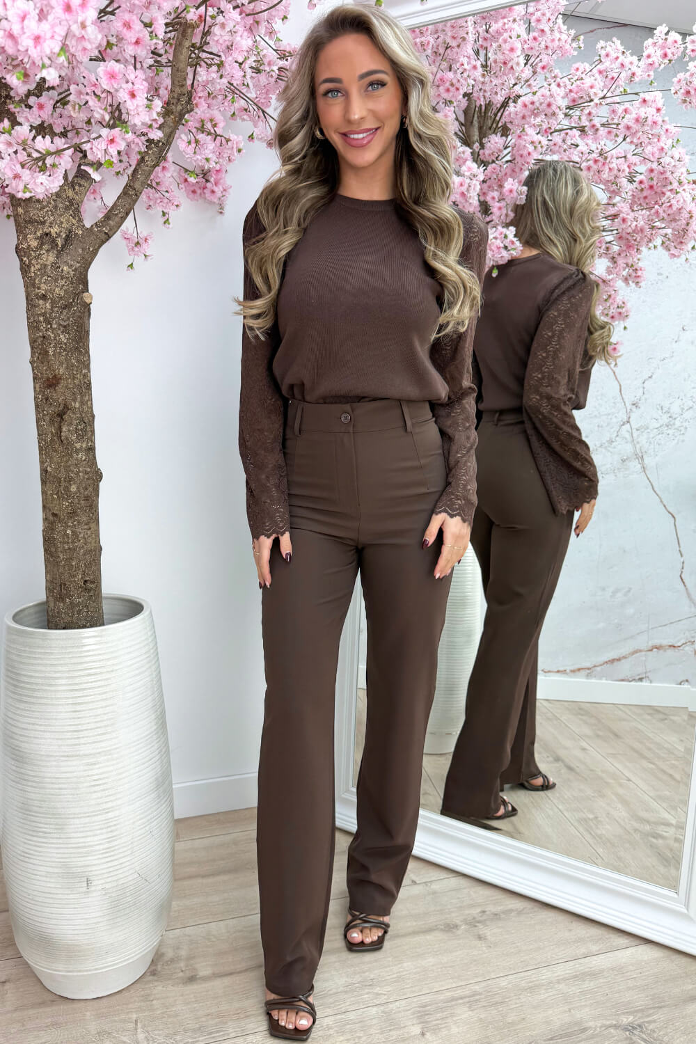 SO PRETTY! 🩷 Dit is zo’n topje waar je meteen even voor stopt — die kanten flared mouwen met roosjes zijn gewoon té leuk. Het lijfje is gemaakt van een stretchy ribstof, dus hij zit ook nog eens heerlijk. Win-win!