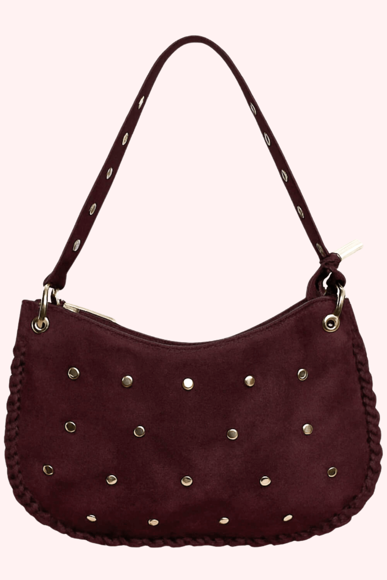 SUEDE STUDDED BAG 🤎 Suede is dé trend van dit moment… en deze tas is precies waarom! De Suede Studded Bag is gemaakt van echt leer met een supermooie suede look, heeft gouden studs (helemaal trendy!), gevlochten details langs de rand én genoeg ruimte voor al jouw essentials.