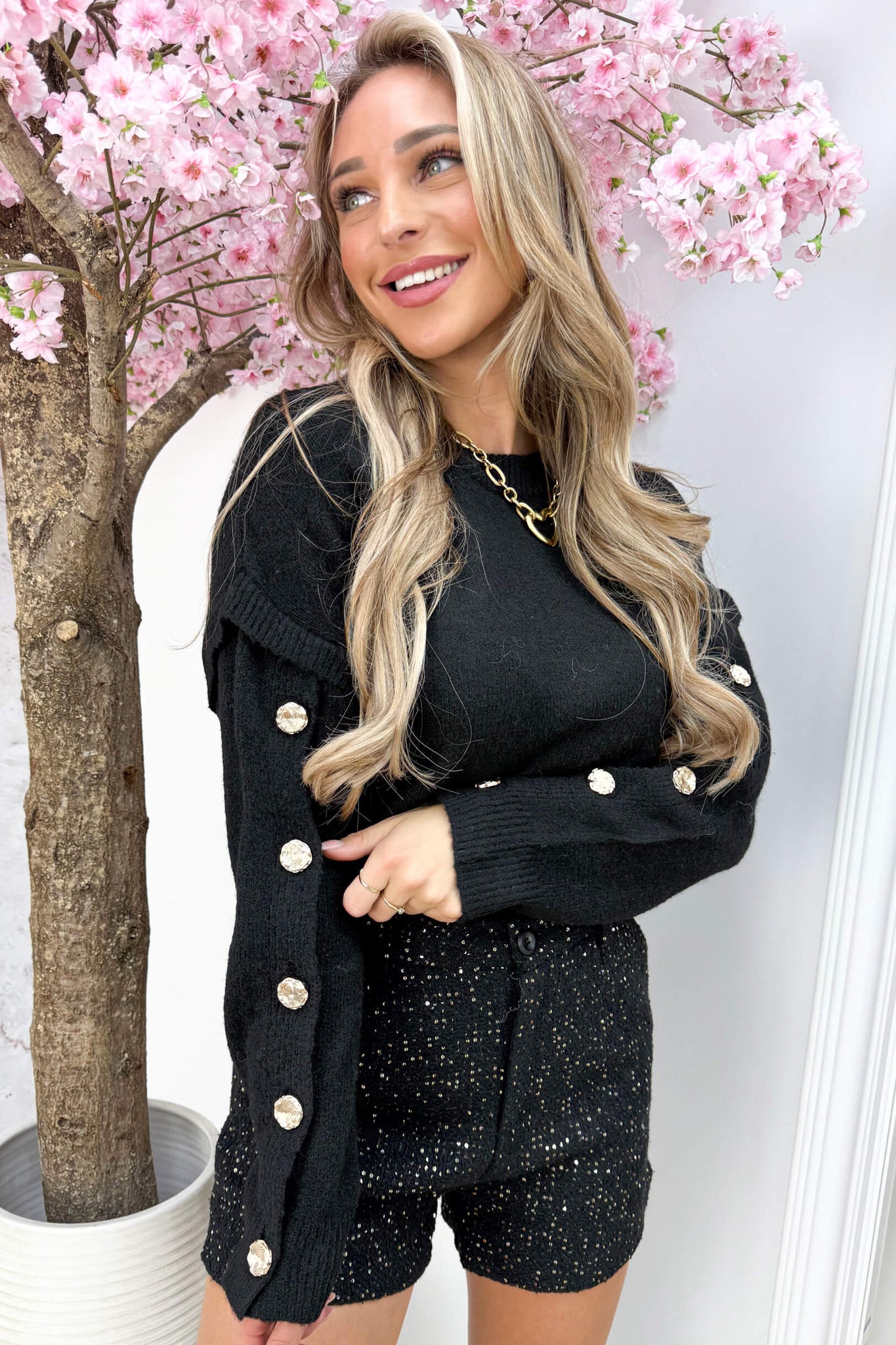 Knitted gold button trui - Zwart