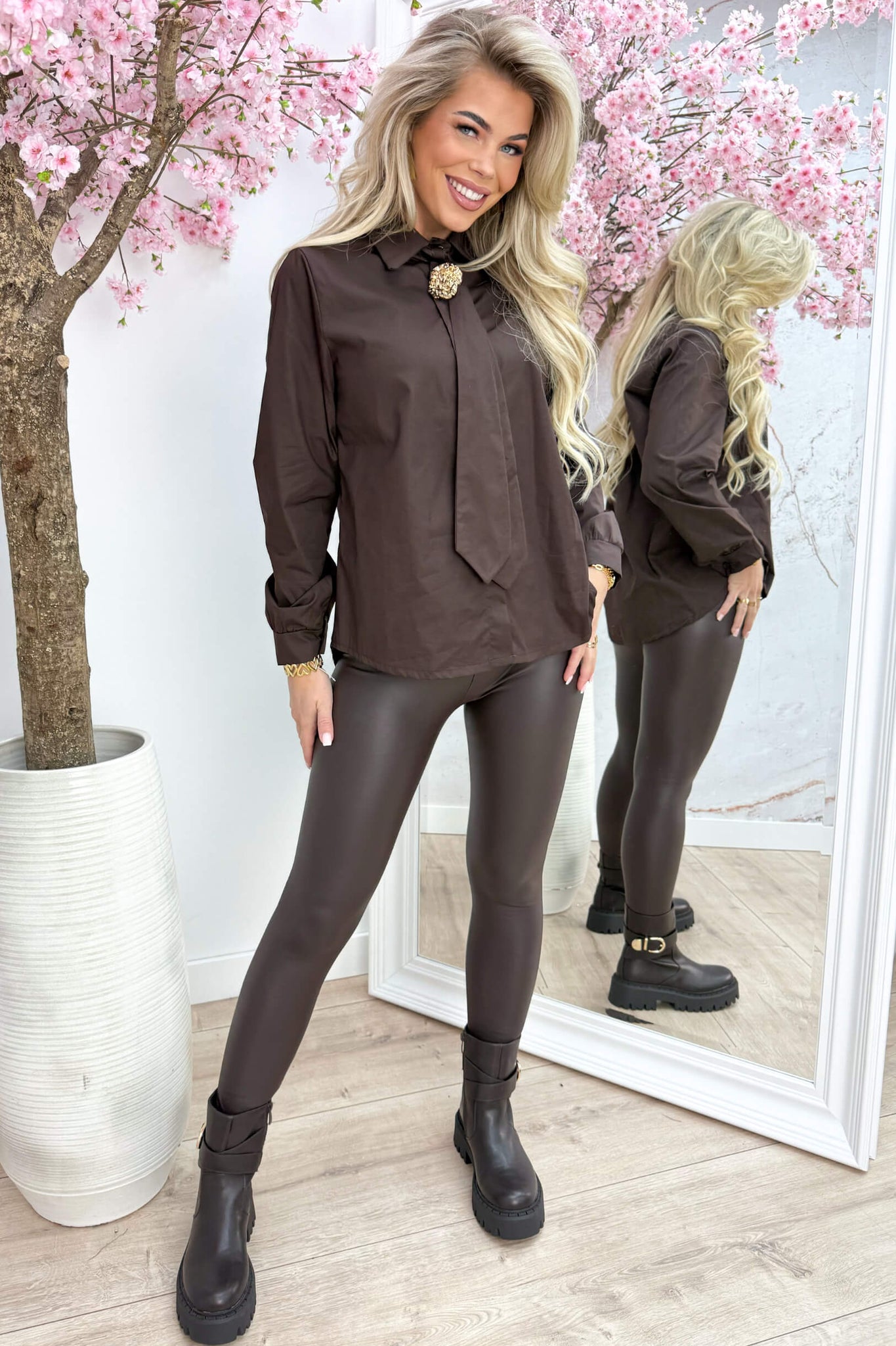 De Golden Broche Blouse is alles behalve standaard! Met de stropdas, het chique gouden broche detail en de 100% katoenen kwaliteit krijgt je outfit meteen een classy upgrade. Perfect voor werk, feestje of een chic dinner date.