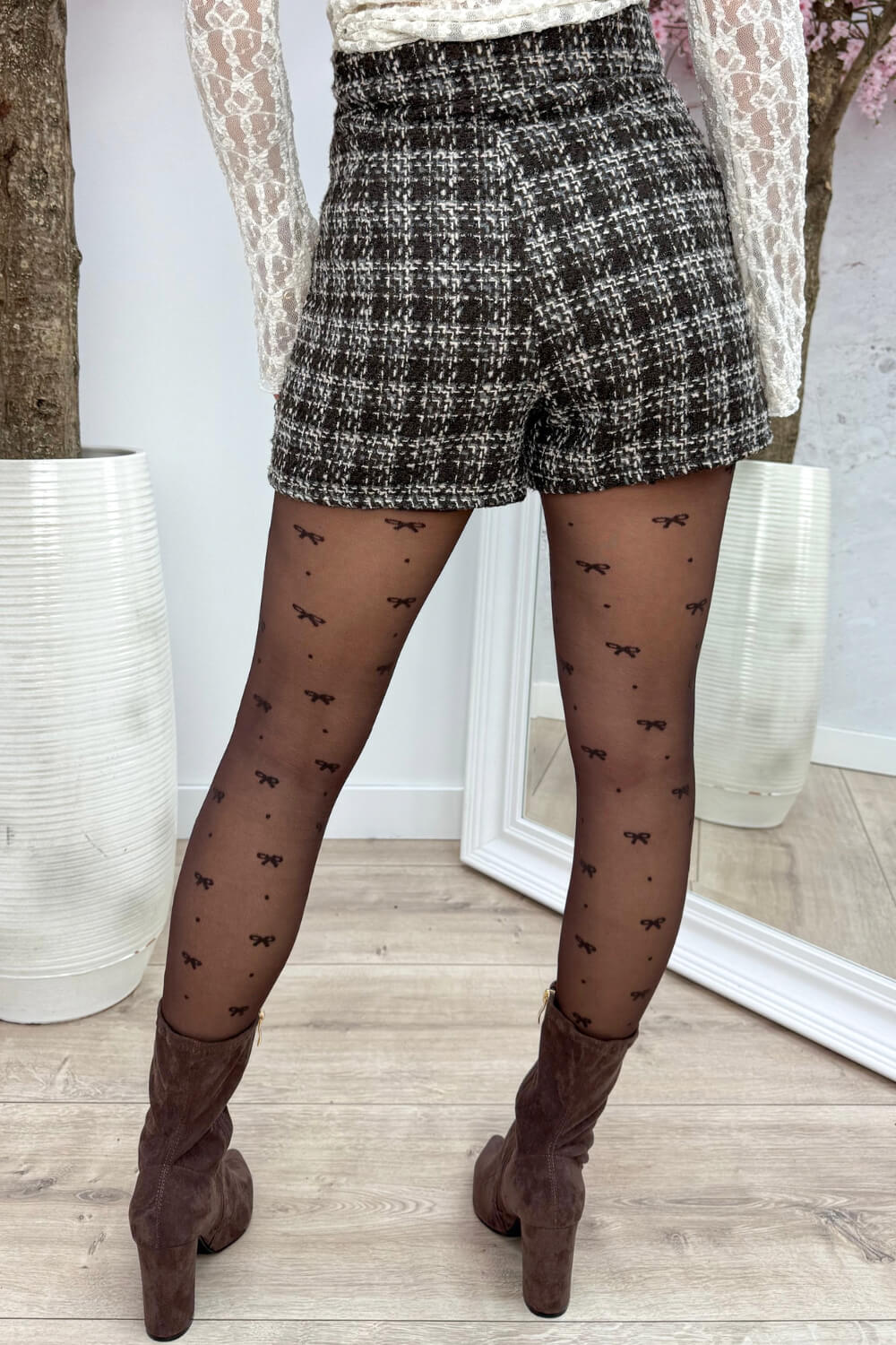 TOO CUTE! 🤎 Een ding is zeker... De Bow Panty maakt elke outfit helemaal af! Deze panty is gemaakt van een stretchy stof, heeft een hoge taille, is 20 denier & die strikjes? Te cute!