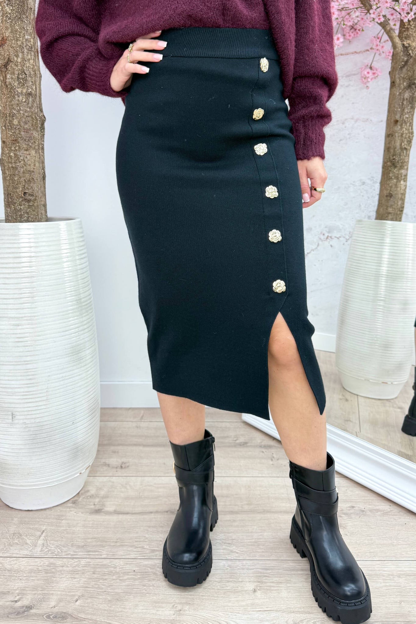 Gold rose button split skirt - Zwart
