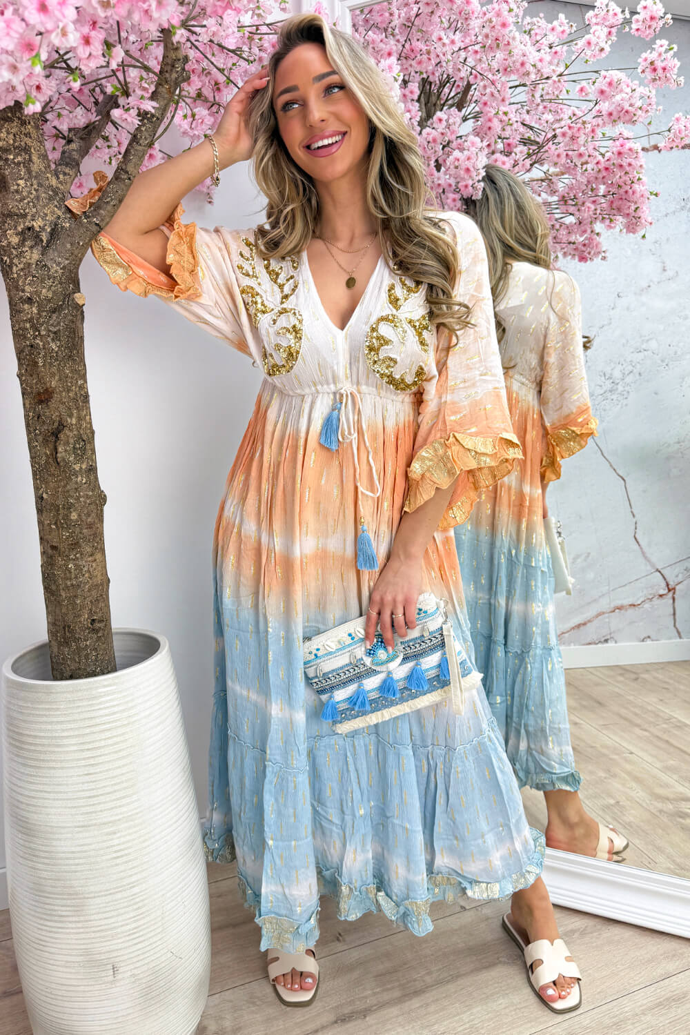 De Havana Beach Dress is gemaakt van een heerlijke luchtige stof en heeft het perfecte maxi model! 🤭 En die details… ja echt, waar moeten we beginnen?! 😱 Goud- en zilverkleurige accenten all over ✨ ruffles op de mouwen en onderaan met ook dit accent, een pailletten patroon op de borst en touwtjes met kwastjes in de taille waarmee je ‘m mooi kunt tailleren 😍 (en ja… die kwastjes komen ook weer terug op de rug! 🌸) Eerlijk… dit is zo’n jurk die alles heeft! 🌴
