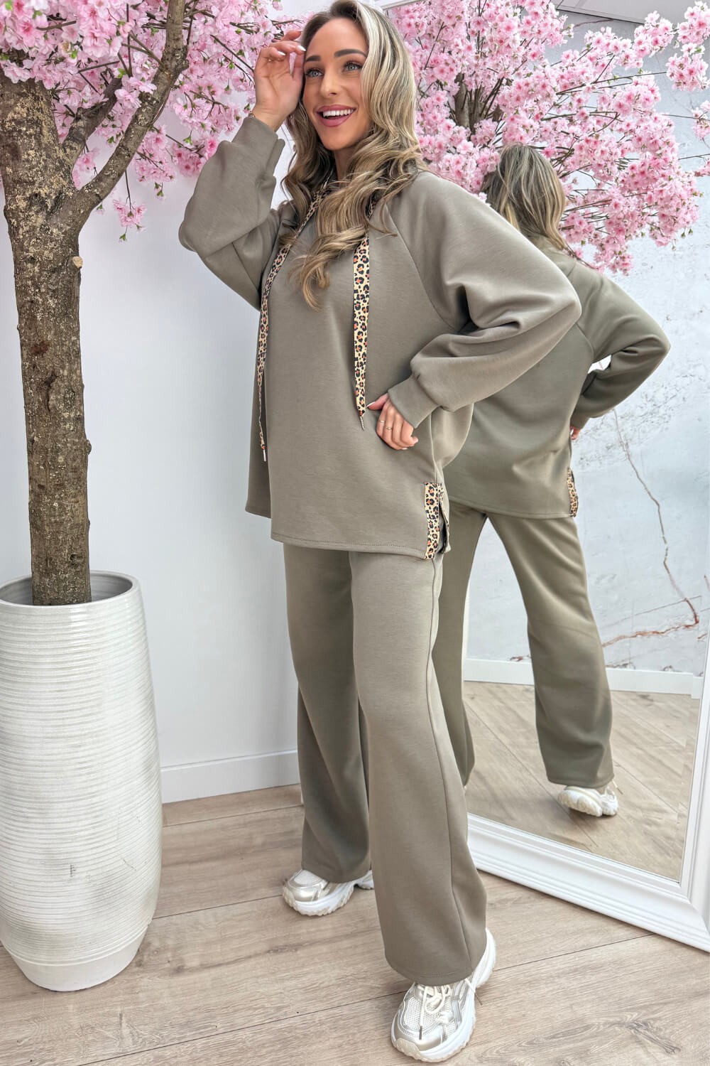 De set bestaat uit een hoodie met leopard lintjes en leuke splitjes aan beide kanten, inclusief leopard print details. De bijpassende straight leg jogger heeft diezelfde leopard lintjes weer terug, waardoor alles perfect matcht. En ja… het allerbelangrijkste: hij. zit. zo. lekker!