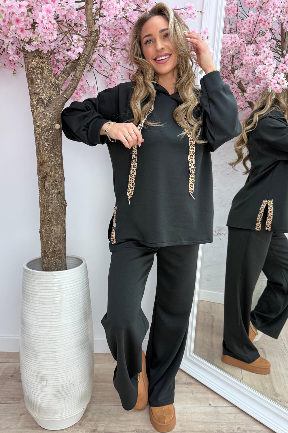 De set bestaat uit een hoodie met leopard lintjes en leuke splitjes aan beide kanten, inclusief leopard print details. De bijpassende straight leg jogger heeft diezelfde leopard lintjes weer terug, waardoor alles perfect matcht. En ja… het allerbelangrijkste: hij. zit. zo. lekker!