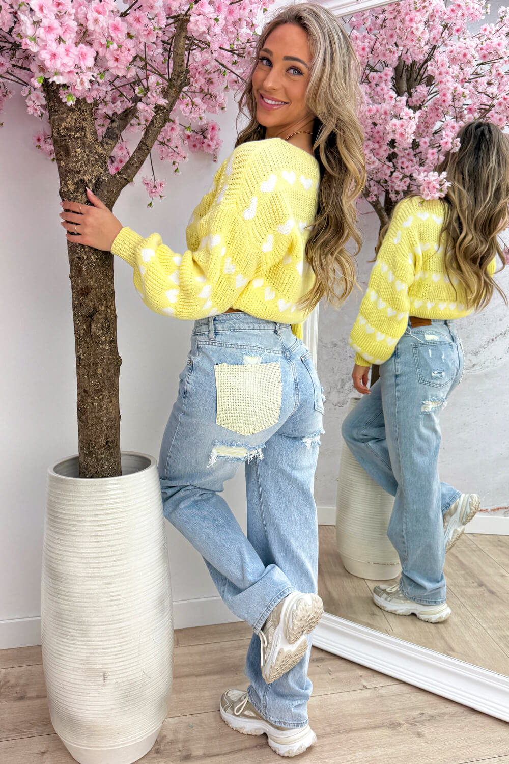 Deze heerlijke gebreide trui zit vol met hartjes (overal ja 😍). Zacht, comfy en precies zo’n trui waar je meteen blij van wordt zodra je ’m aantrekt. Perfect om eindeloos te combineren en ideaal voor elke dag!