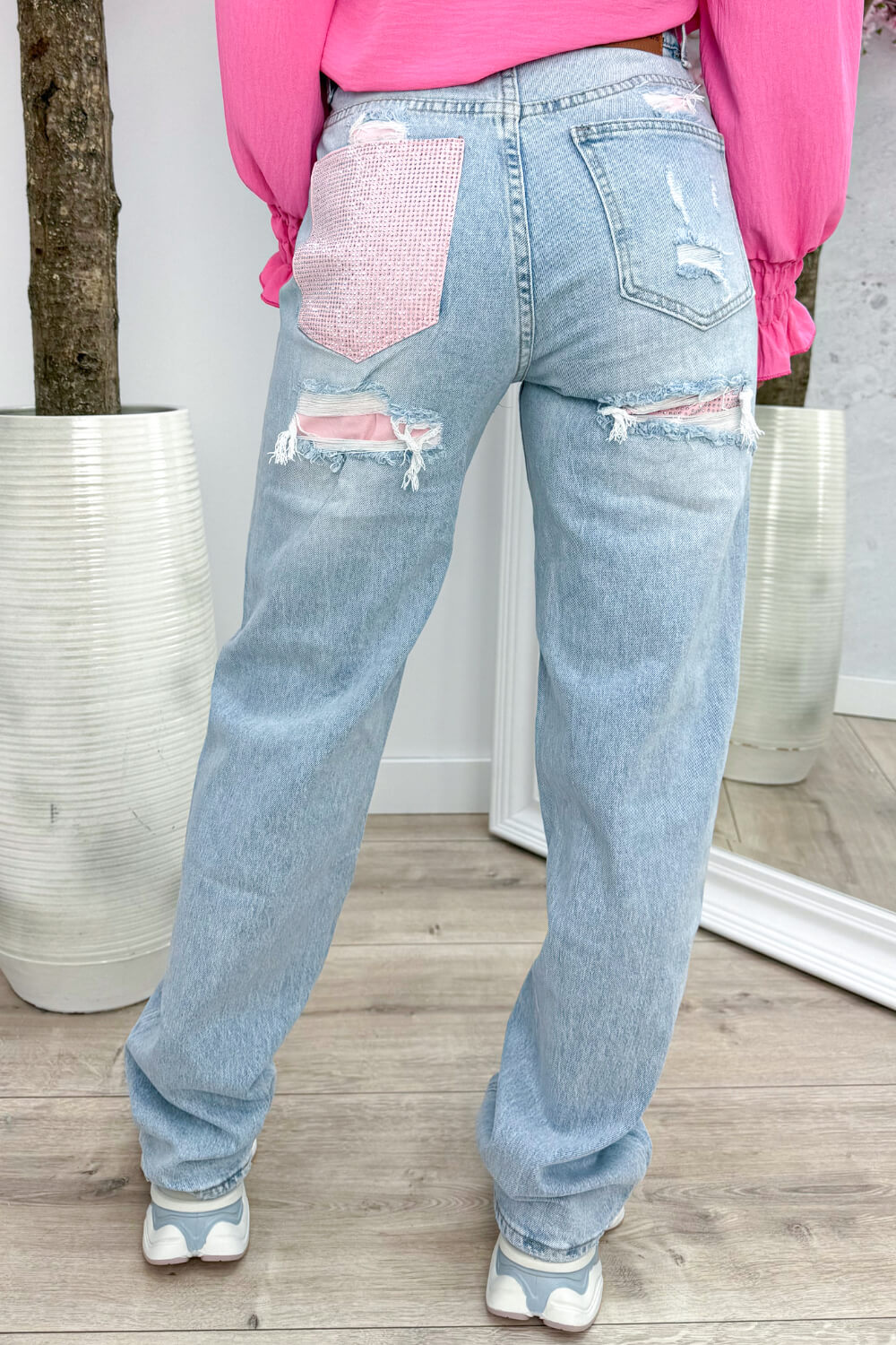 VIRAL JEANS! 🩷 Oké luister… twee keer knipperen en deze jeans is weg! 😱 De Popular Diamond Jeans lijkt van voren misschien een basic, maar draai je om en bam — die roze achterzak met diamantjes en damage details steelt gewoon de show!